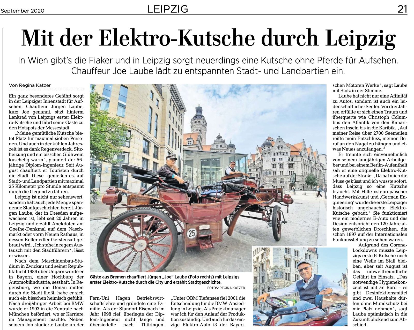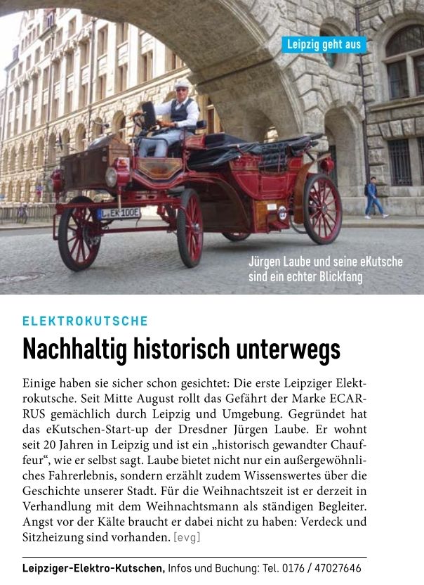 Joe Laube, Entrepreneur & Chauffeur der ersten eKutsche Leipzigs, fragte sich schon vor einiger Zeit, ob dieses historische und zugleich nachhaltige sowie ökologische Tourismus-Angebot zur Stadt Leipzig passt. Ja – es ist in der Tat eine wunderbare Liason.